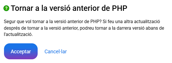 Si accedeixes a la segona opció de "Tornar a la versió anterior de PHP", seguidament el panell mostrarà una advertència indicant que a tots els allotjaments seleccionats se'ls assignarà la versió de PHP que tenien assignada anteriorment a l'actual, independentment que siguin diferents entre els allotjaments: