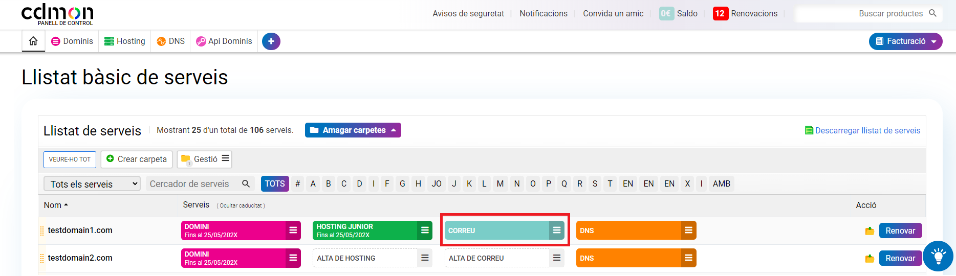 - Des del llistat principal de serveis del teu panell de control, accedeix a la secció "Correu".