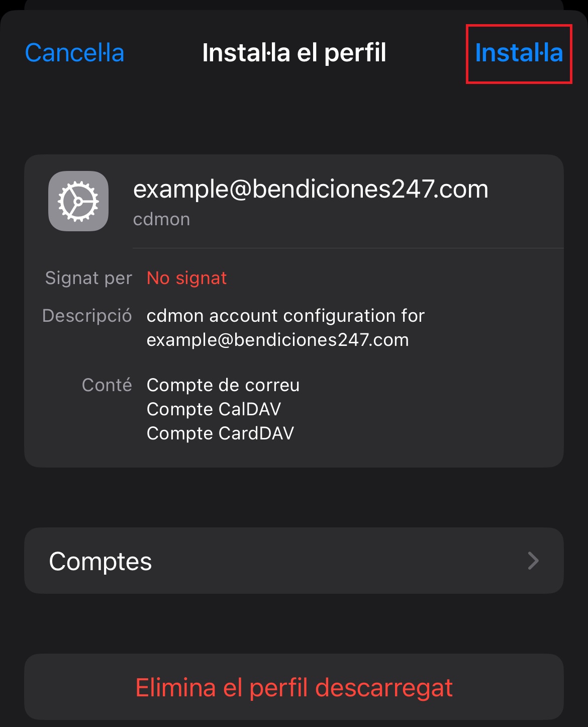 - Nota: En servidors virtuals i dedicats no cal posar "mail." - utilitza directament: https://elteudomini.com/mobileconfig