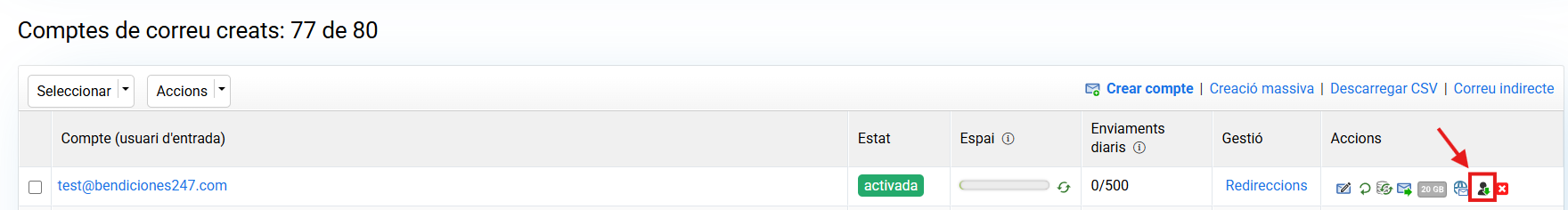 - Al llistat de comptes de correu, veuràs tots els comptes creats. Localitza el compte que vols configurar i fes clic al botó de descàrrega de l’autoconfigurador.