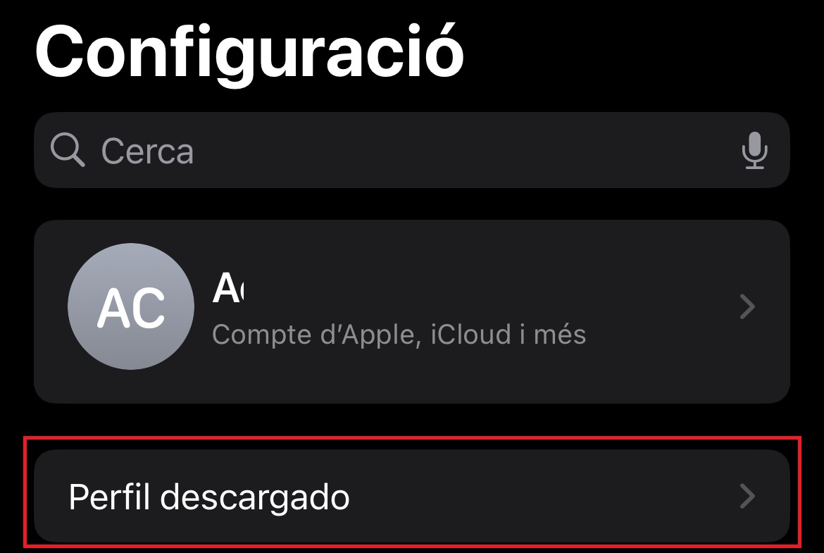 - Obre l’app Configuració al teu iPhone/iPad. Veuràs l’opció "Perfil descarregat" just sota el teu compte d’Apple: