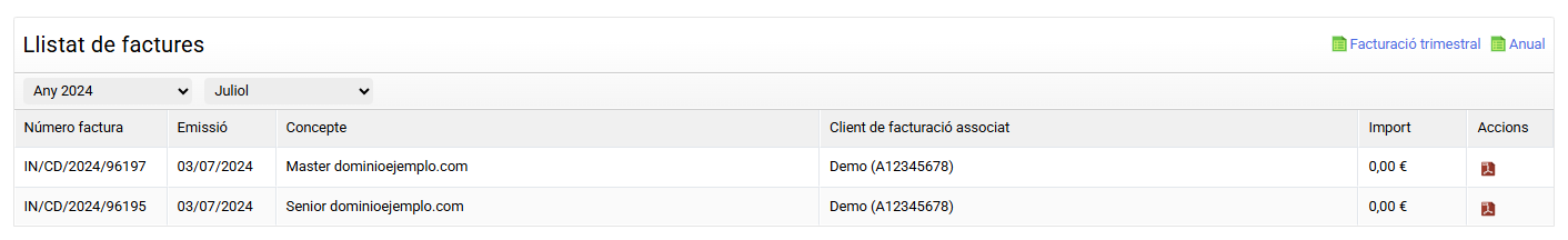 Per a aquest exemple, hem modificat el nostre pla Senior a un Master des del panell de control, i aquests canvis també es reflecteixen en el llistat de factures: