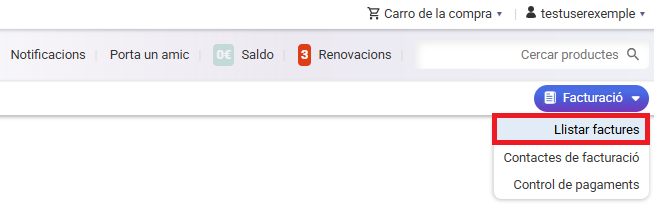 Principalment, has d’accedir al Llistat de Factures del nostre panell de control. Per fer-ho, només has de fer clic al botó blau de Facturació, situat a la part superior dreta, i després fer clic a Llistar factures: