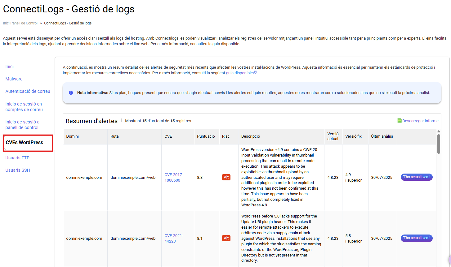 En aquesta secció, es mostrarà un resum de les alertes detectades en els seus hostings. Les vulnerabilitats es presenten amb diferents colors segons el seu nivell de criticitat, facilitant la identificació ràpida dels problemes més greus.