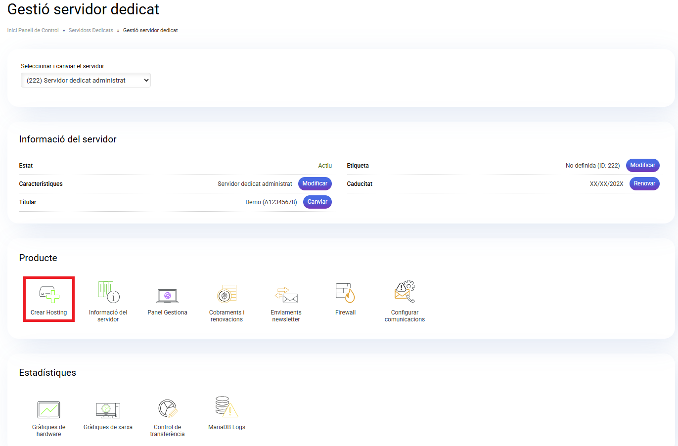 Dades de connexió per al panell de Marca blanca Gestiona: dades de connexió per al panell de control de l'allotjament web del domini. Aquest panell de control és de marca blanca i s'hi accedeix a través de l'adreça www.dominiallotjat.com/pcontrol.