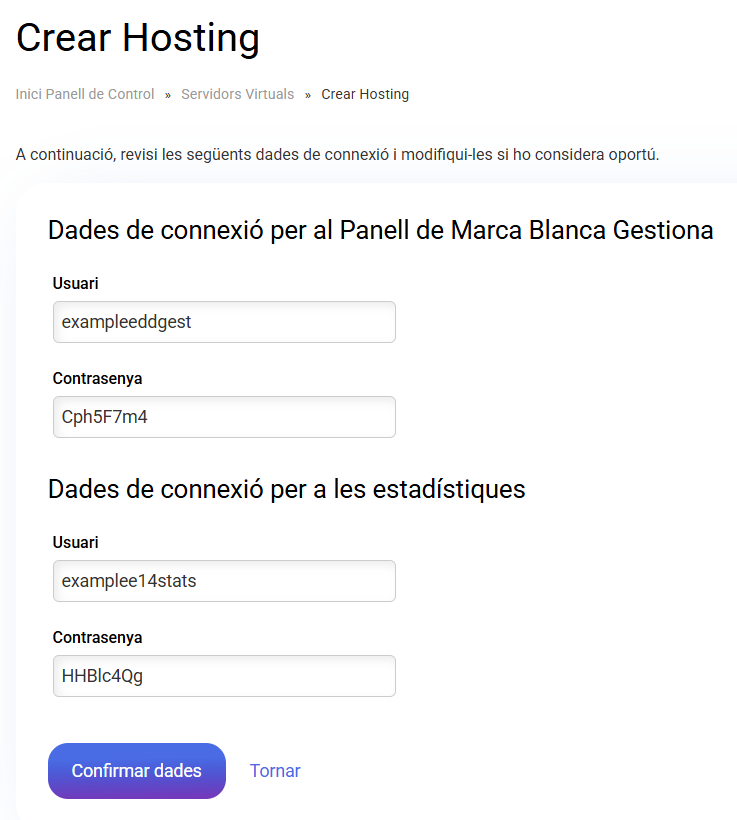 Dades de connexió del nou allotjament - Es generarà automàticament l'usuari i contrasenya dels diferents serveis, es poden modificar pels que vostè desitgi.
