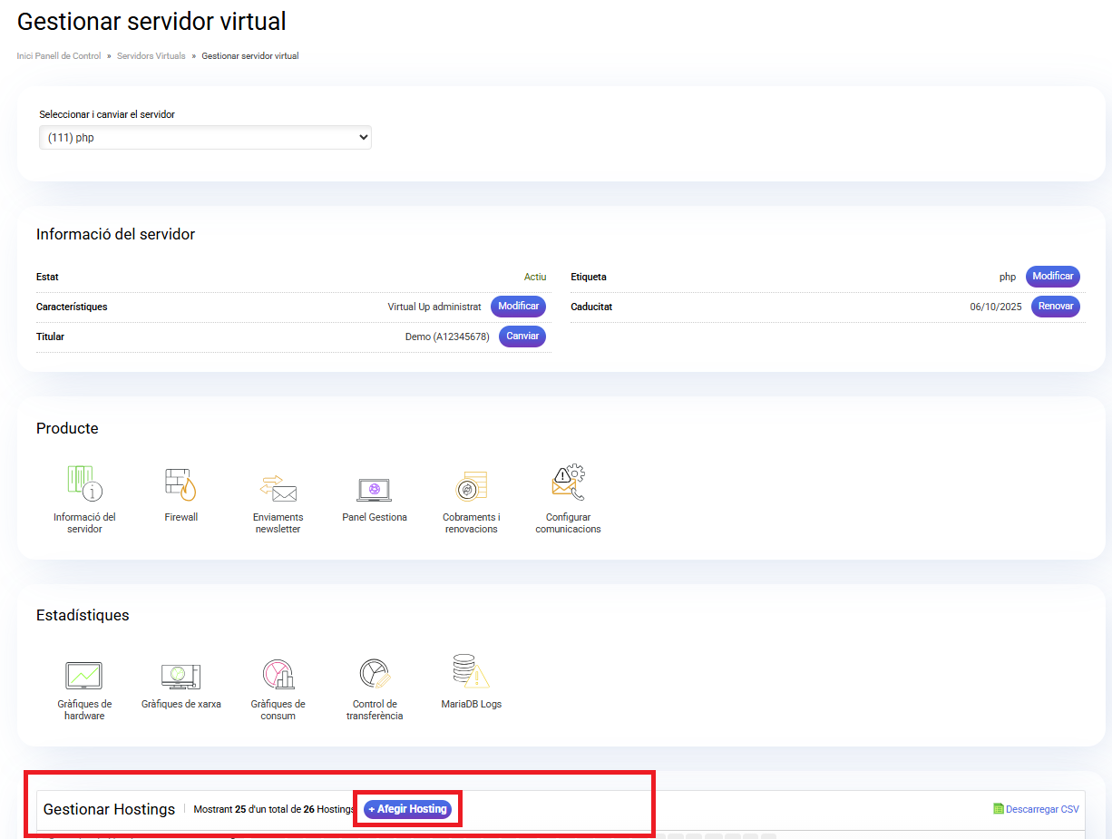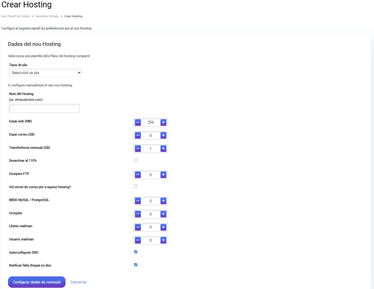 Un cop en la finestra "Gestionar servidor Virtual", has de clicar en l'opció + Afegir hosting, on accediràs a un formulari et permetrà crear l'allotjament web repartint tots els recursos disponibles.