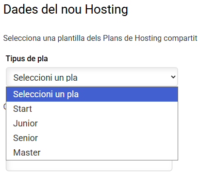 Crear hosting - En aquest apartat s'assignen les dades del nou hosting