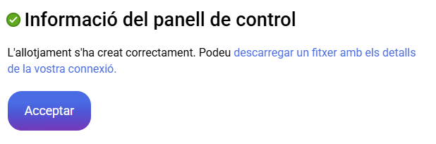Apareixerà una finestra com la següent per a la confirmació de l'alta del hosting. Des d'aquest pot descarregar un CSV amb les dades de connexió (només es veuran les dades d'usuari, per seguretat no mostrarem les contrasenyes)