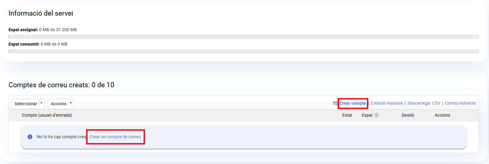 - L'espai del compte. Apareix per defecte el màxim disponible, 5120 MB. Si necessites més espai en el compte pots passar-la a Premium una vegada estigui activa.