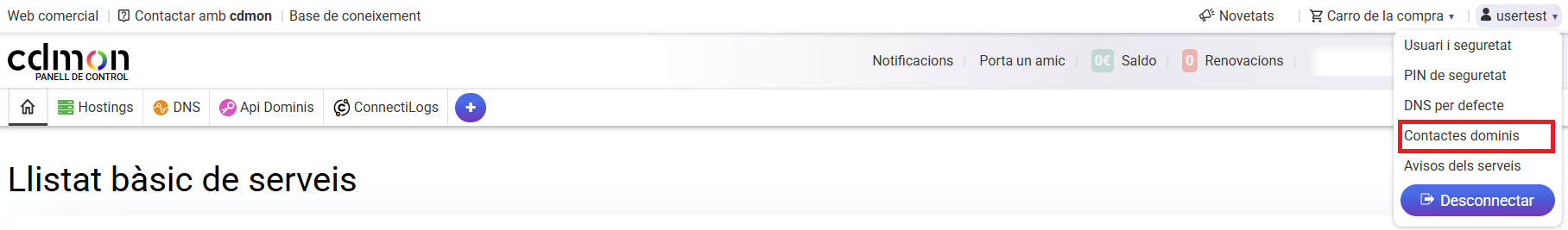 Per accedir a aquest apartat ha de prémer a "Gestió de l'usuari" i seguidament a "Contactes dominis" a la part superior dreta del Panell de Control.