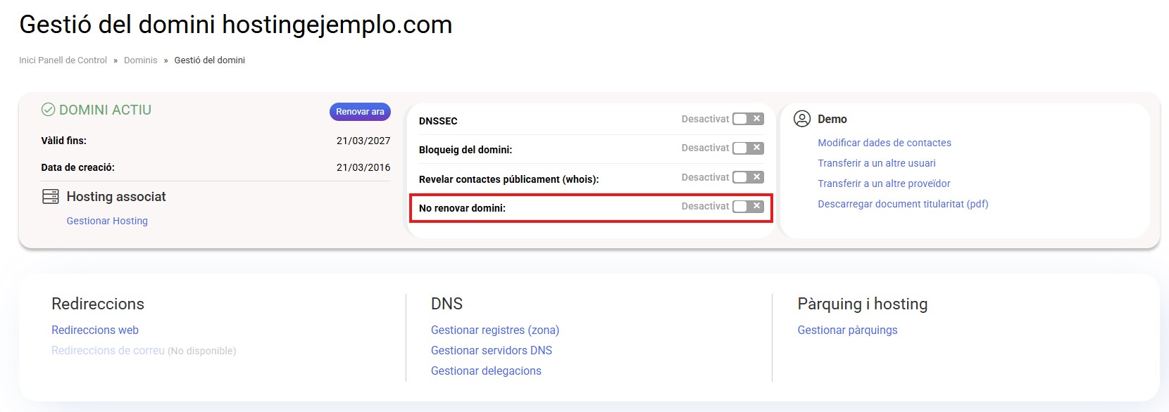 No recomanem que desactivis els avisos de caducitat tret que estiguis segur que no desitges renovar el domini.