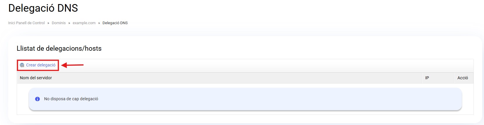 En el formulari "Crear delegació DNS" pots crear els subdominis que seran donats d'alta com a registres de servidors DNS.