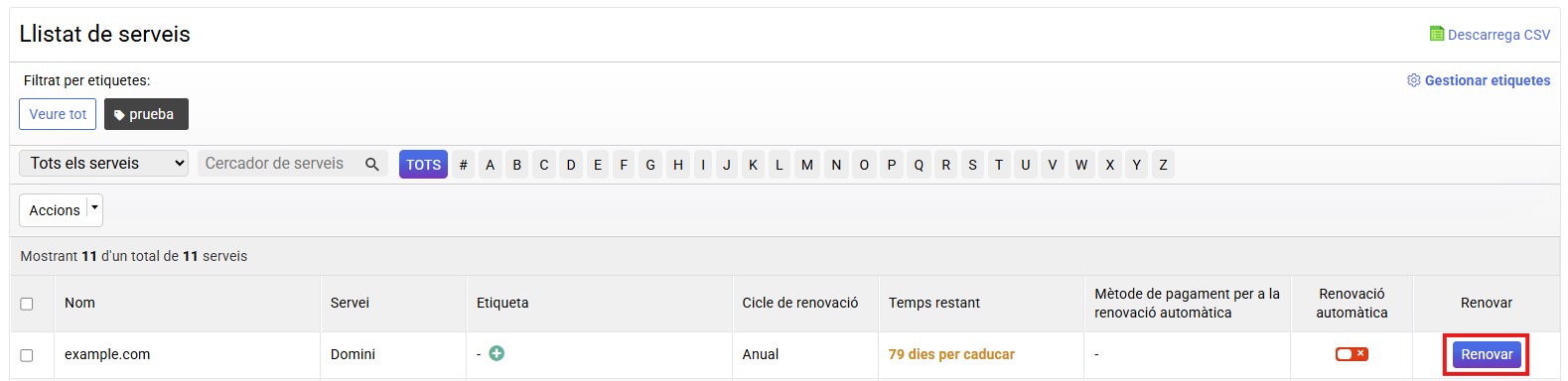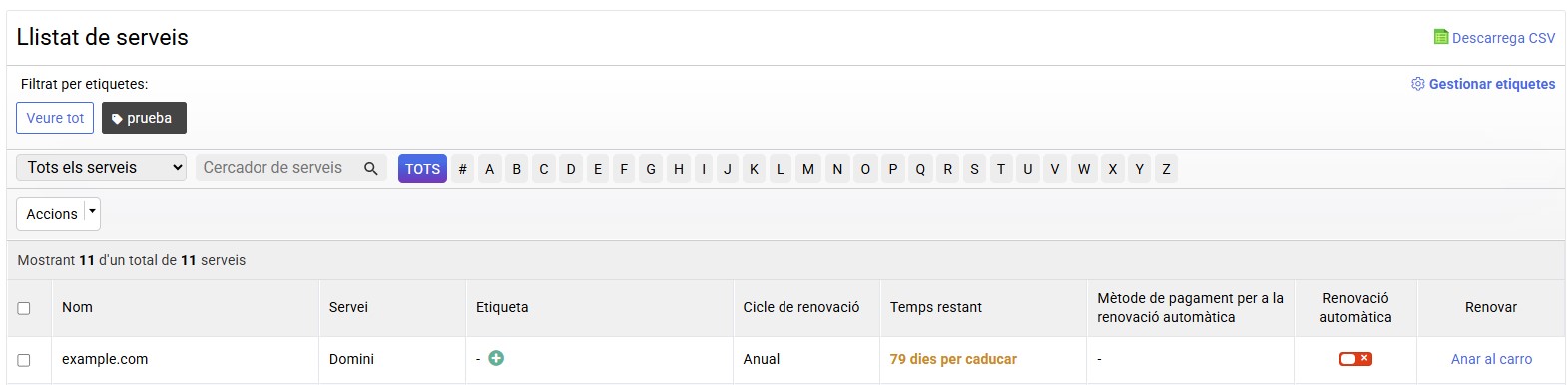 En el "Panell de renovacions" o "Control de renovacions" podràs veure els serveis que tens contractats i que estan pendents de renovació. Has de prémer en l'opció Renovar en cadascun dels serveis que vulguis renovar i automàticament el producte s'afegirà al carro de la compra.