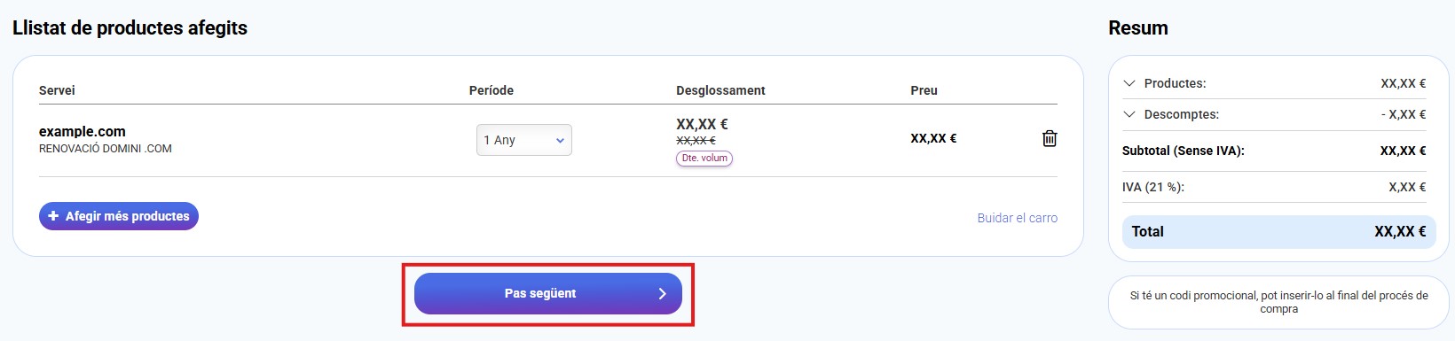 Des del carro podràs seleccionar el període de renovació (1,2,3,5 o 10 anys). Quan tinguis el domini o dominis en el carro de la compra, prem en l'opció Pas següent per seguir el procés de pagament i finalitzar el procés de renovació.