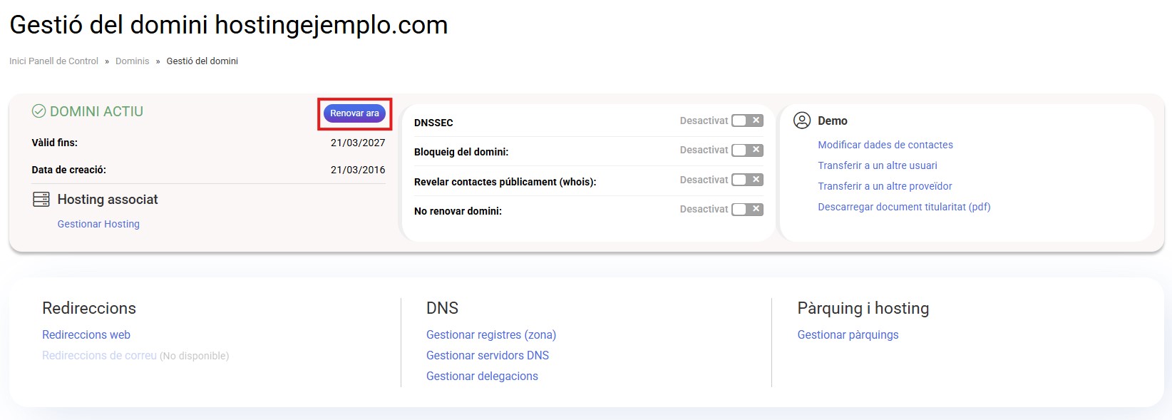 Per renovar el domini tens dues opcions, des del panell de renovacions o des del panell de gestió del domini.