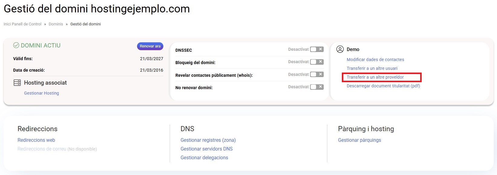 Dins de la gestió d'un domini, per sol·licitar el AUTH CODE, prem en l'opció Transferir a un altre proveïdor.