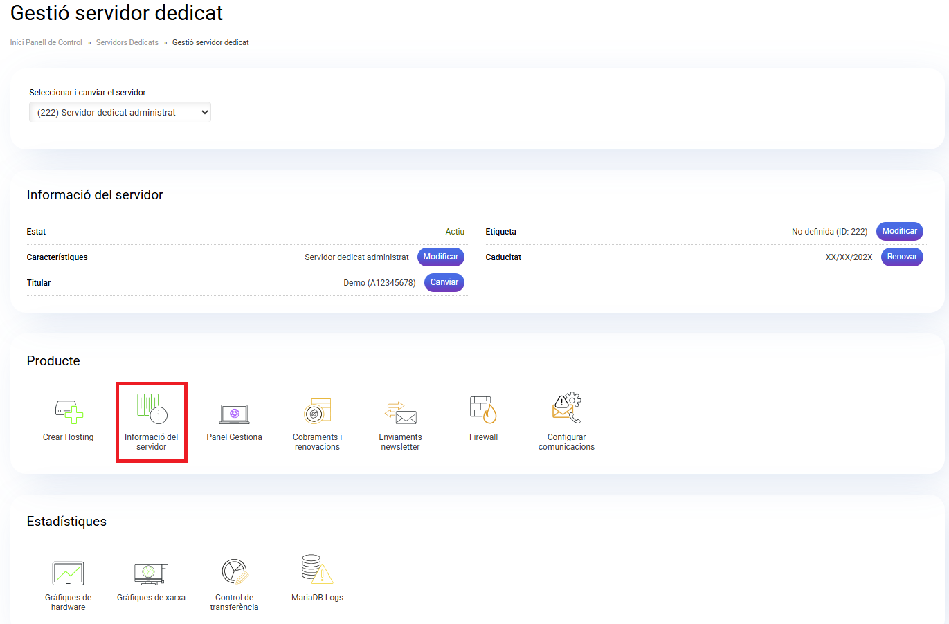En la següent pantalla podràs observar tres grans blocs; Informació del servidor Dedicatl, Informació del servei i Llistat actual (amb el llistat d'allotjaments).