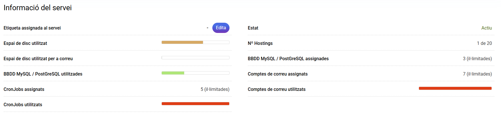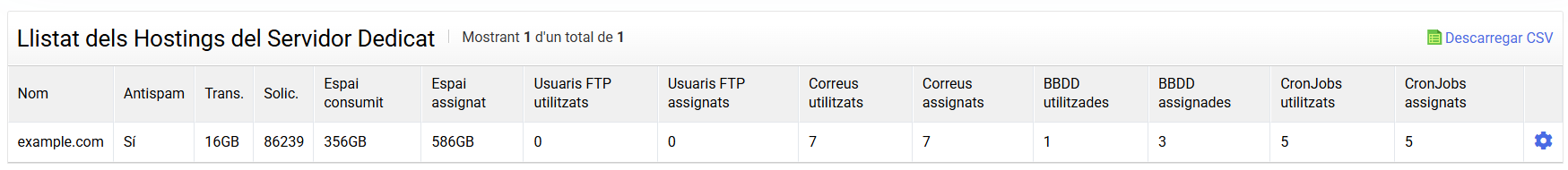 En aquest llistat podràs veure l'espai consumit per cada allotjament, la transferència mensual consumida, el nombre de sol·licituds acumulades al mes i el nombre de correus, BBDD i crons utilitzats.