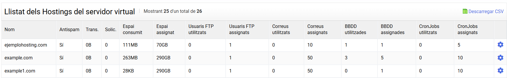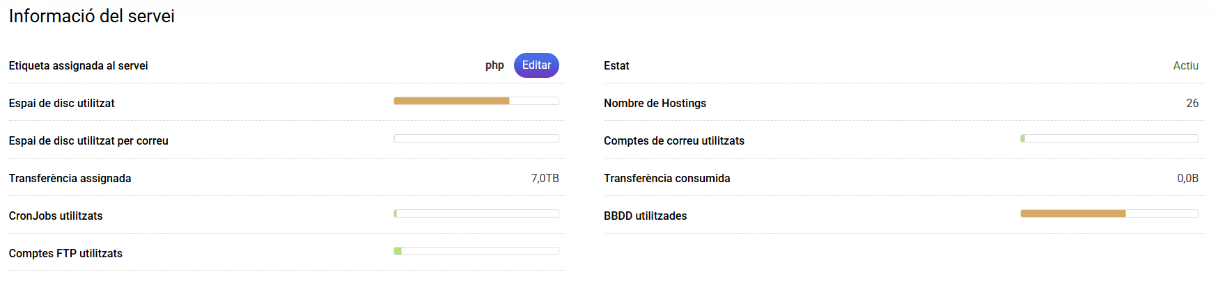 En aquest llistat podràs veure l'espai consumit per cada allotjament, la transferència mensual consumida, el nombre de sol·licituds acumulades al mes i el nombre de correus, BBDD i crons utilitzats.