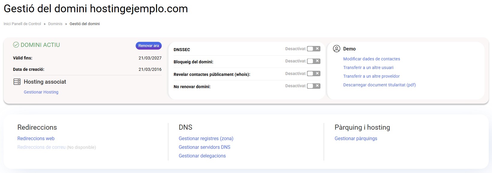 Una vegada premuda l'opció Domini, accediràs a la pantalla de "Gestió del domini", on trobaràs tota la informació del domini i accions que pots realitzar.