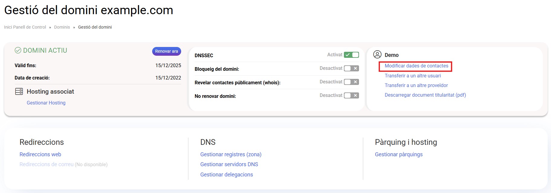 Si desitges modificar les dades del titular d'un domini TLD (totes les extensions excepte .és), pots fer-ho de forma senzilla des del panell de control de cdmon. La modificació de les dades del nom i/o e-mail del titular d'un domini han de ser validats pel compte de correu actual del titular, i en cas que també es modifiqui el compte de correu, aquesta ha de ser validada pel compte actual i per la nova. Aquesta validació es realitza mitjançant un enllaç que s'envia al compte o a tots dos comptes.