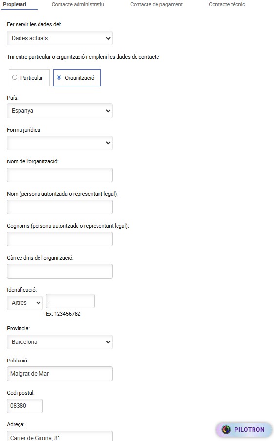 Des d'aquest apartat disposes d'un formulari per a modificar les dades del contacte titular. Tens dos tipus de formularis, una per a particulars i un altre per a organitzacions.