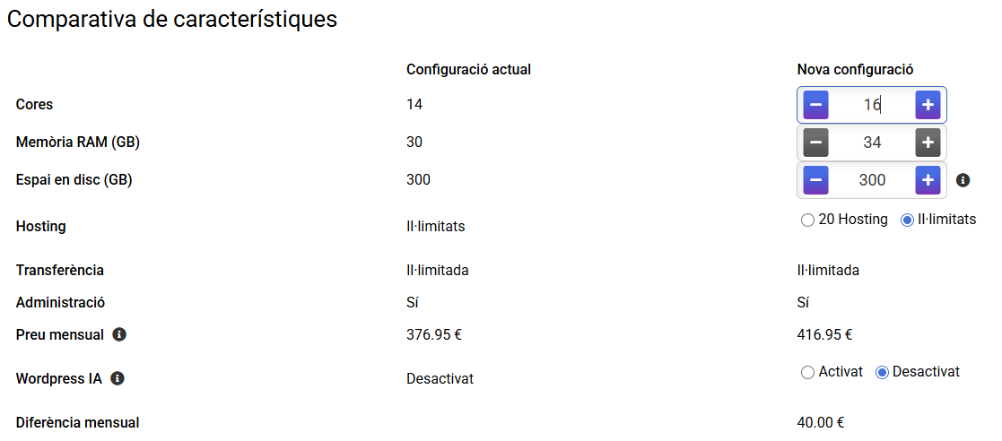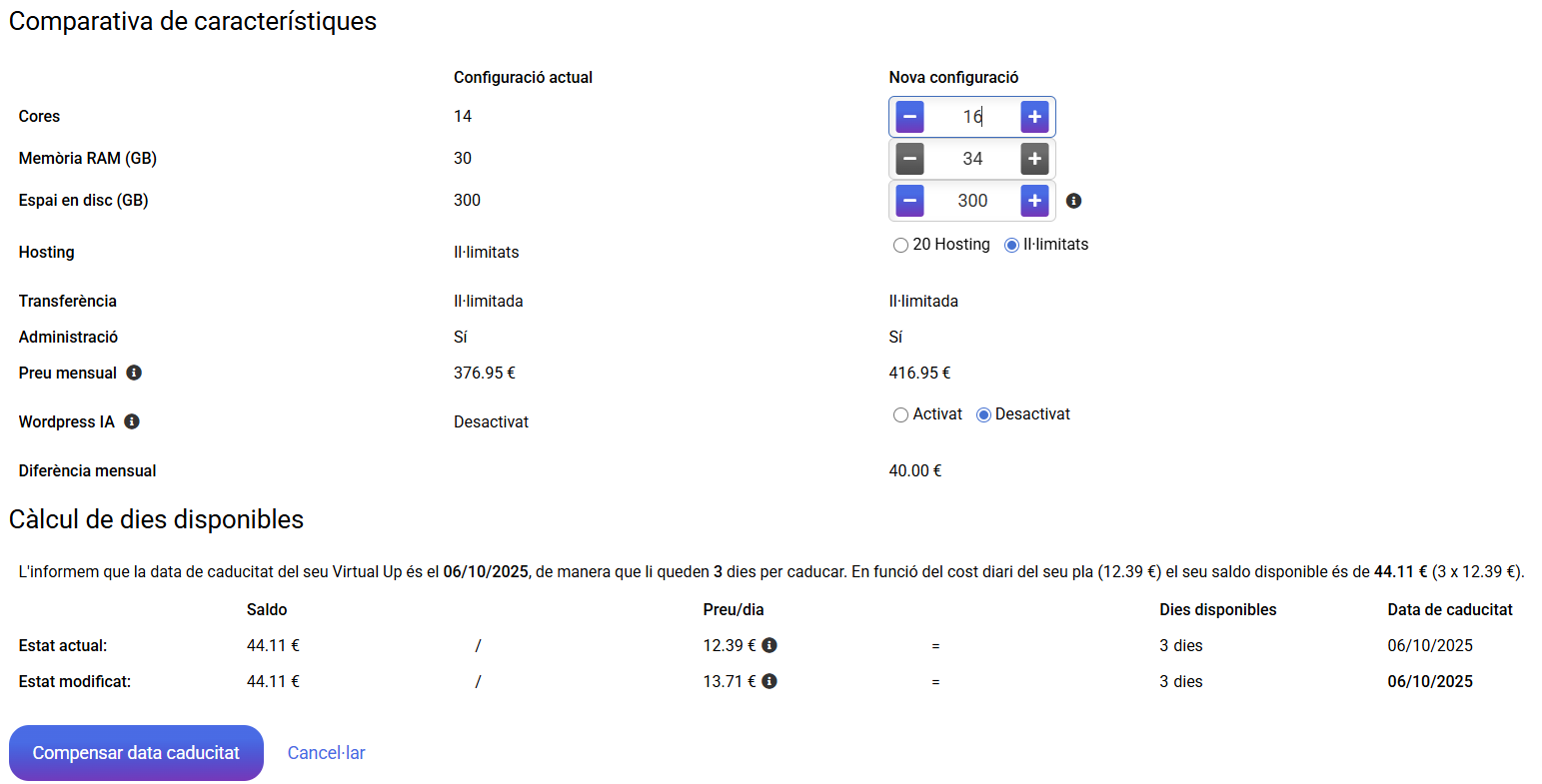 En aquest formulari podràs modificar: Cores, Memòria Ram, Espai en Disc i el número de Hostings allotjats. Si modifiques Cores, Ram o Espai en disc, es reiniciarà automàticament el servidor Virtual Up.