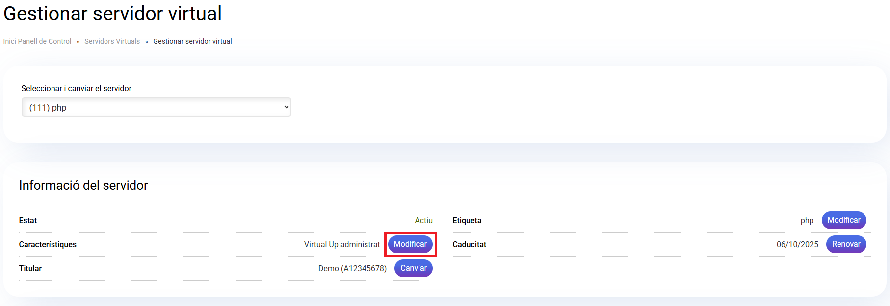 En accedir a la secció d'ampliar les característiques apareix un formulari on pots modificar la configuració del servidor Virtual Up.