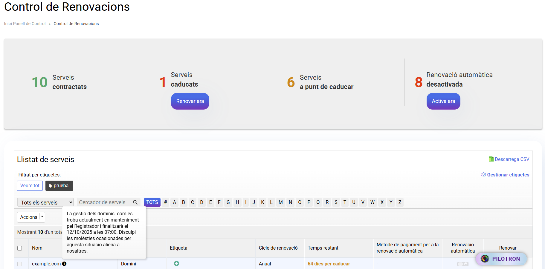 En aquest cas, l'única acció que no es pot realitzar és Renovar un domini que estigui en manteniment, però per a evitar incongruències amb la resta d'accions possibles, hem bloquejat la possibilitat de realitzar cap acció relacionada amb la Renovació i la Renovació automàtica, d'igual forma hem afegit un avís per a informar de l'estat del domini: