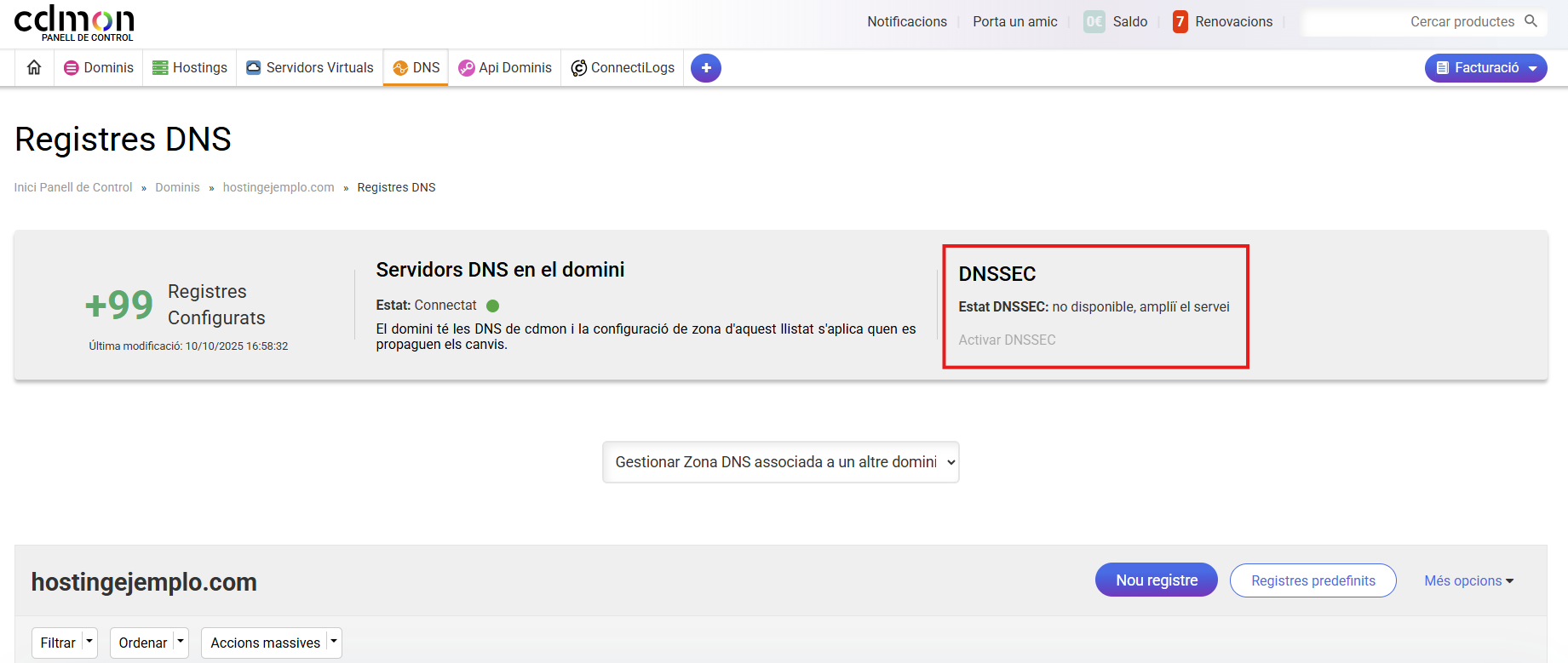 En aquesta pantalla hem bloquejat el botó d'habilitar/deshabilitar les DNSSEC que és l'única acció que entra en conflicte amb el manteniment d'un domini, la resta d'accions continuen estant disponible durant aquest procés, pot crear, editar i eliminar registres sense cap problema: