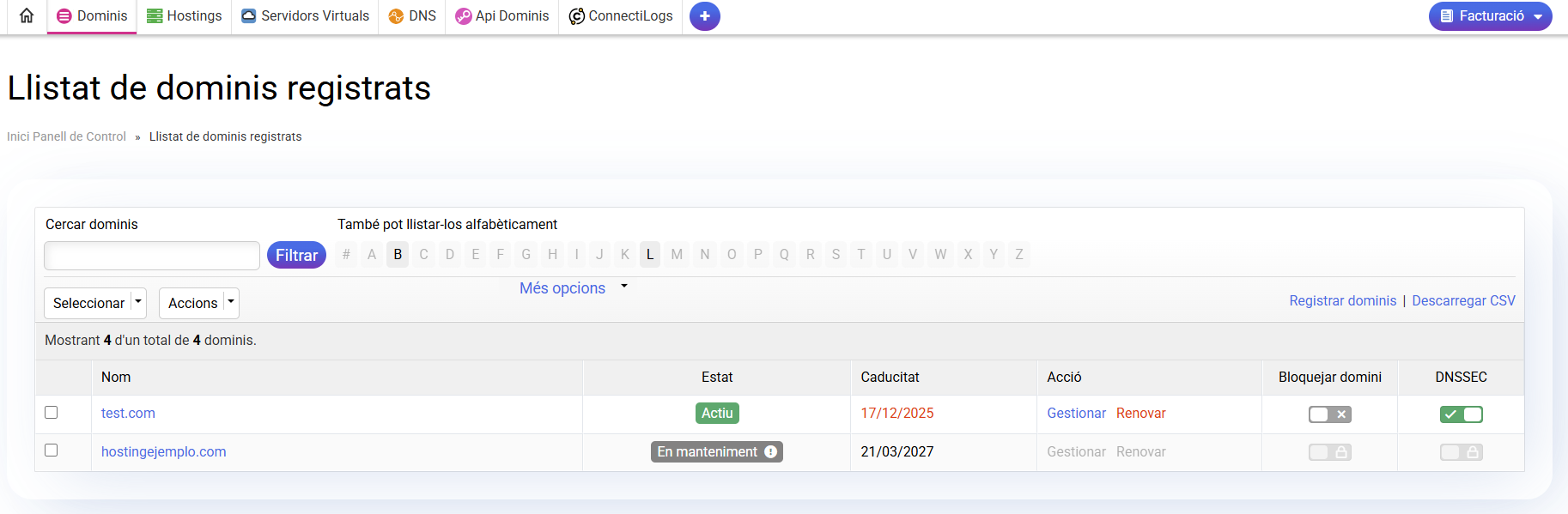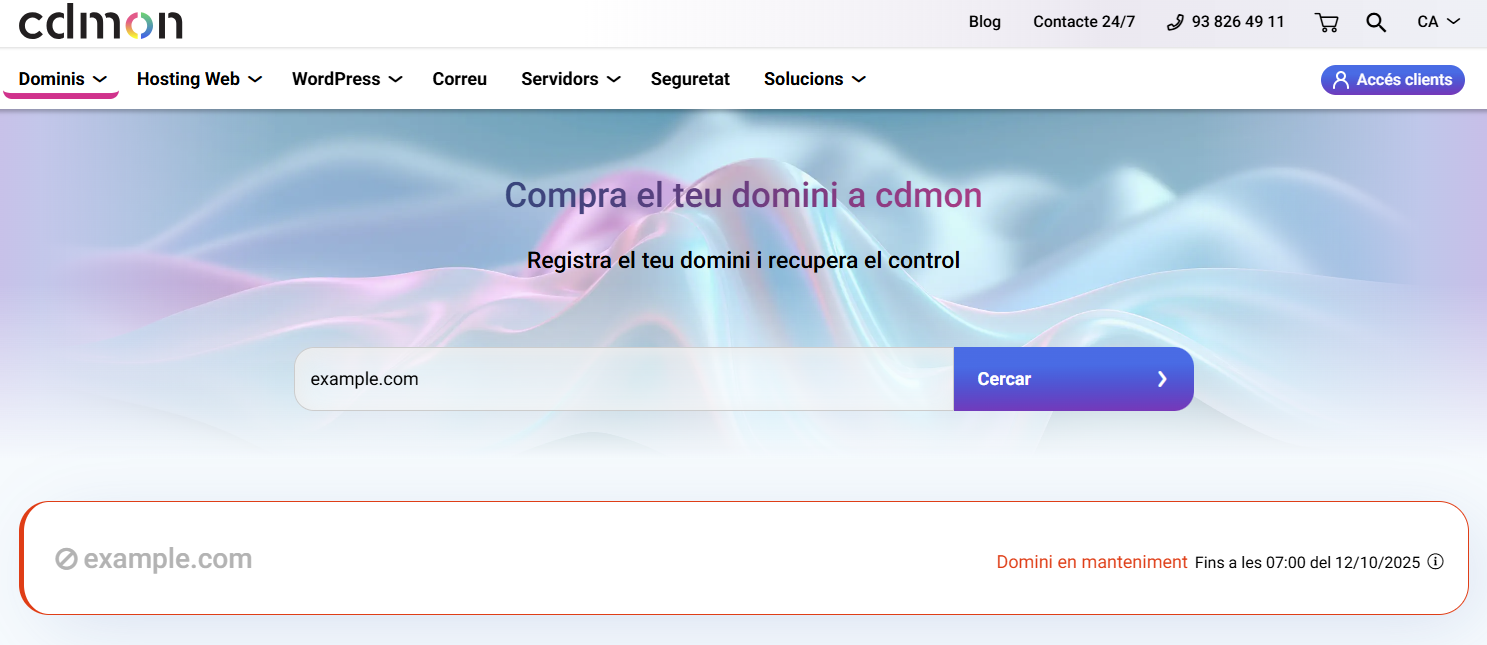 Com hem comentat anteriorment, no és possible realitzar cap mena de gestió mentre duri el manteniment, per la qual cosa hem bloquejat la possibilitat d'accedir a aquesta pantalla, redirigint a la pantalla de Llistat de dominis, on pot trobar la informació sobre l'estat del seu domini.