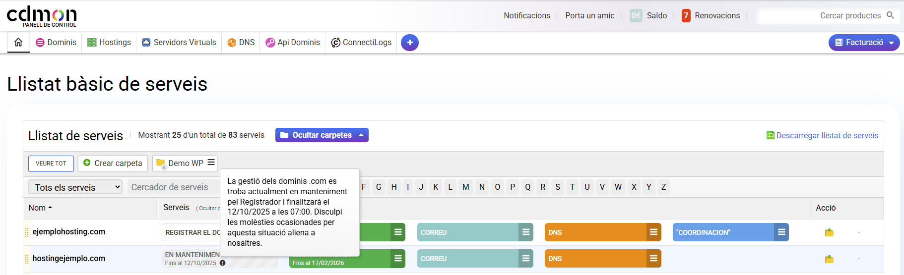 Des del seu llistat de dominis podrà veure el seu domini en manteniment i tampoc podrà fer cap gestió en aquest. També es bloquegeu les accioens massives per a evitar incongruències mentre duri el manteniment.