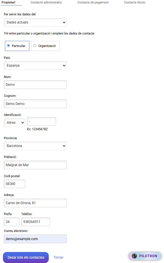 Des d'aquesta secció pots modificar les dades del contacte del propietari, contacte administratiu, contacte tècnic i contacte de pagament: