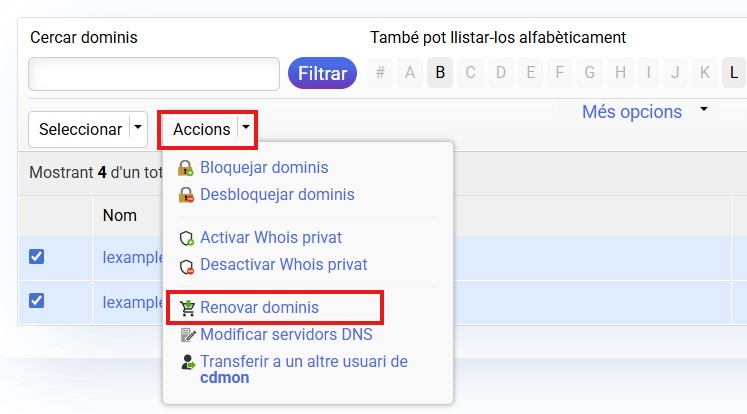- En el desplegable "Accions" prem en l'opció Renovar dominis.