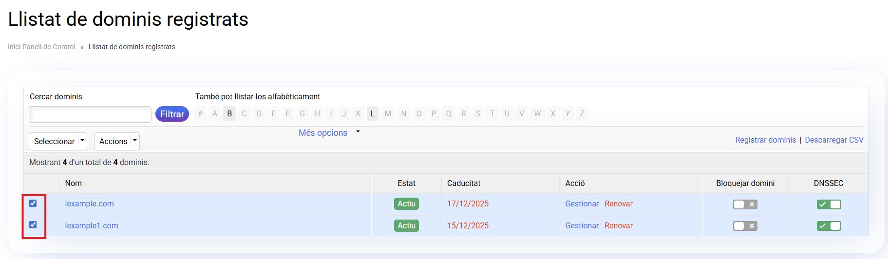 - Selecciona els dominis que vols renovar.