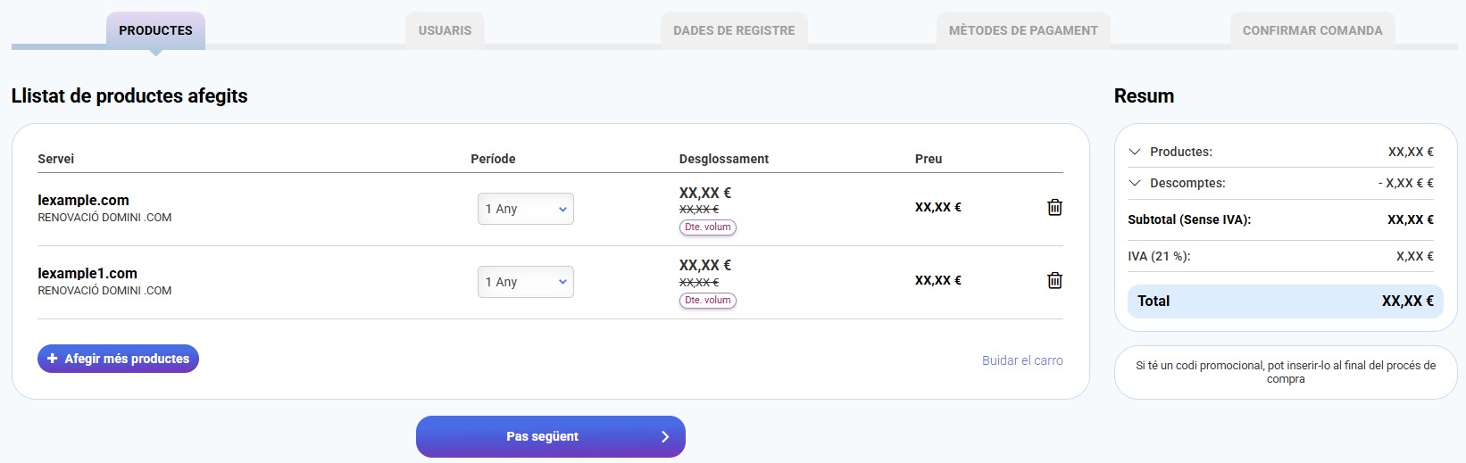 - Després de prémer l'enllaç "Anar al carro" t'envia automàticament al carro de la compra amb els dominis per renovar. Pots seleccionar el període de renovació de cada domini i fer clic en Pas següent per seguir el procés de pagament i renovar els dominis.