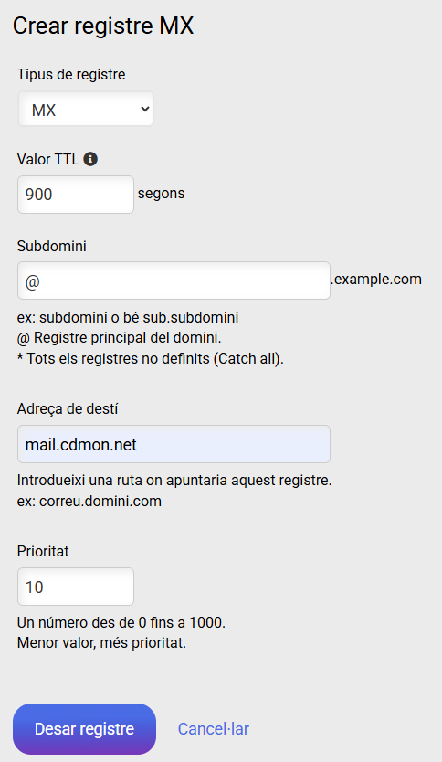 Nota: En cas que no tingui cap registre tipus MX creat o tingui un altre diferent del que es mostra a la imatge les dades a introduir són les mateixes, és necessari que el domini acabi amb el següent registre DNS creat: