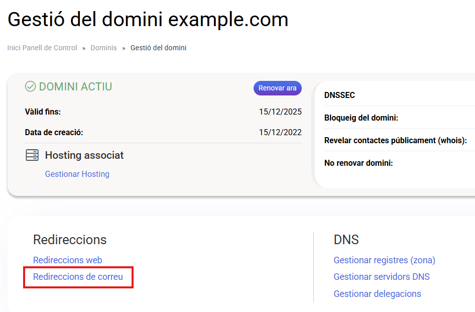 Un cop posat les dades clica sobre “Guardar registre” per finalitzar el procés. Si ara tornem a la Gestió del domini en qüestió podrà observar que les redireccions de correu ja es mostren disponibles: