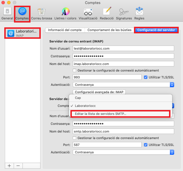 En Informació del servidor, ves a Servidor de correu sortint (SMTP), fes clic a Edita la llista de servidors SMTP