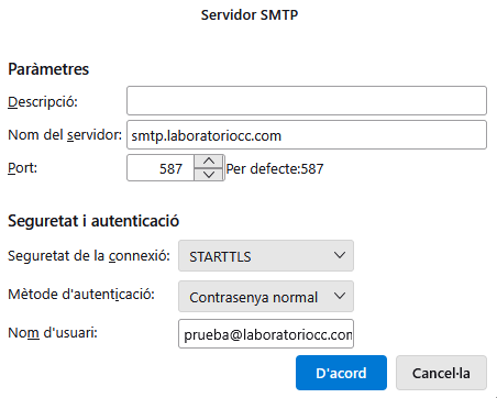 - Seguretat: STARTTLS (587) o SSL/TLS (465)