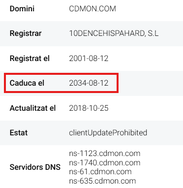 A continuació us mostrem com verificar la data de caducitat que podeu trobar en fer una consulta Whois d'un domini:
