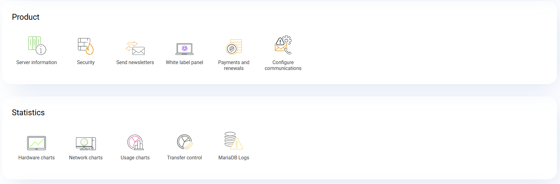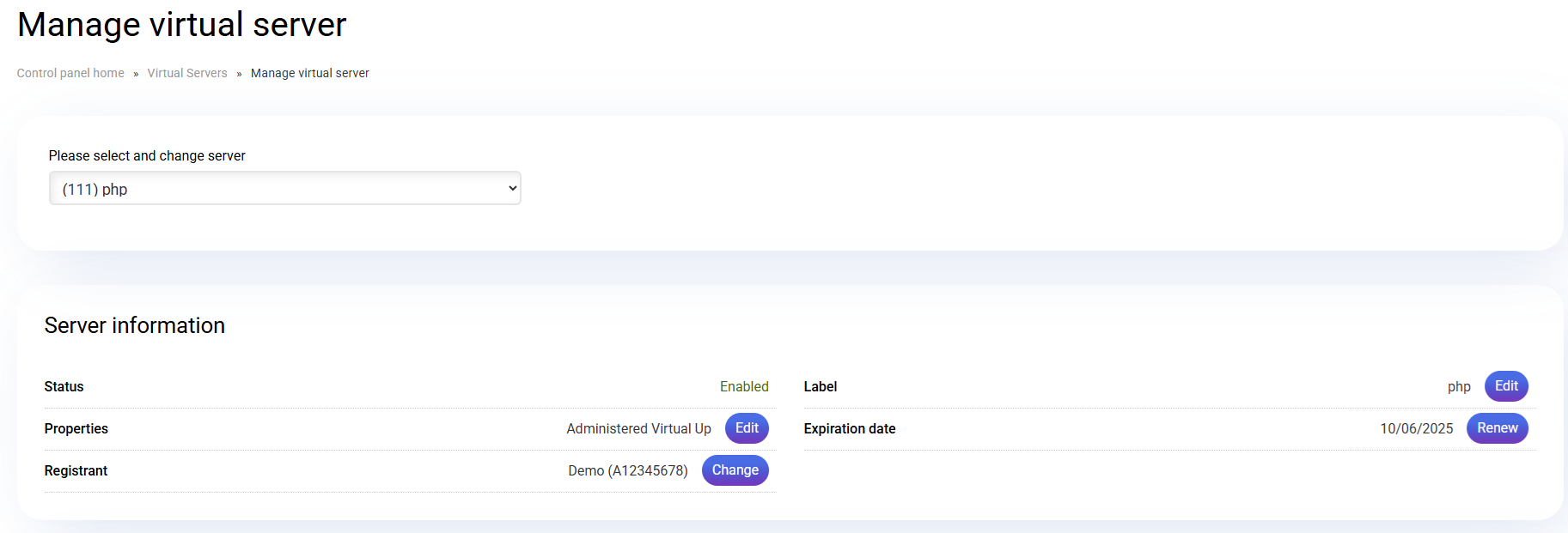 From the administrative section, you will be able to perform administrative operations such as renewing, upgrading features, and switching to another server if you have more than one contracted.
