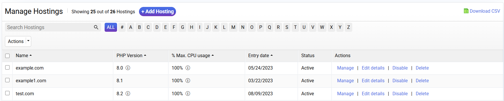 + Add hosting: form to create new hostings on your server.
