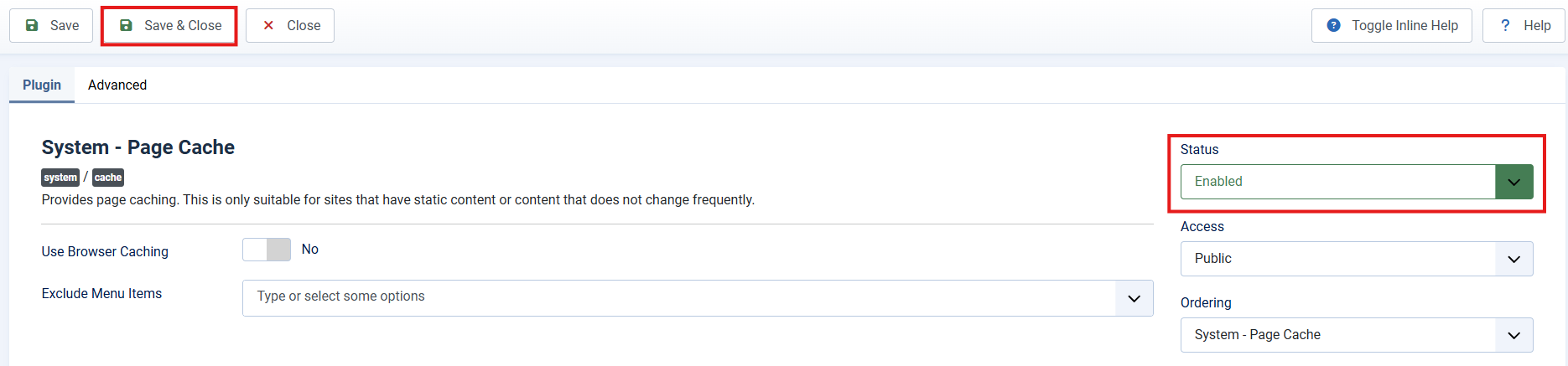 When accessing it, you must verify that the plugin status is “Enabled”. If not, open the dropdown to change it and click “Save & Close” to activate it: