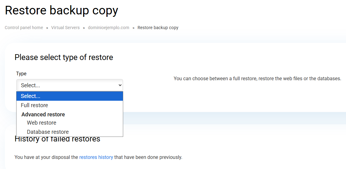 Complete restoration:The complete restoration retrieves all databases and files in the hosting, and replaces the current content.