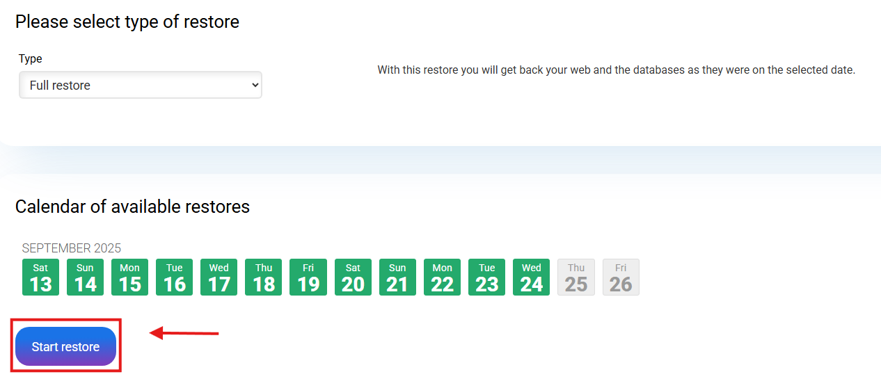 As soon as you select the restore type, the dashboard displays a calendar with all available copies. You must click on the day you want to restore and click on "Start Restoration"