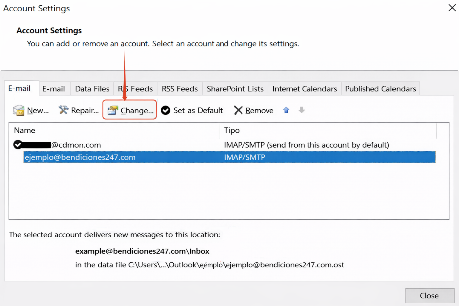 - Select your email account and click Change