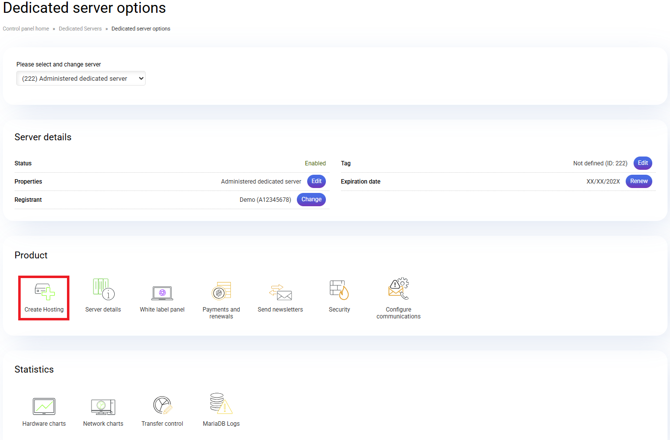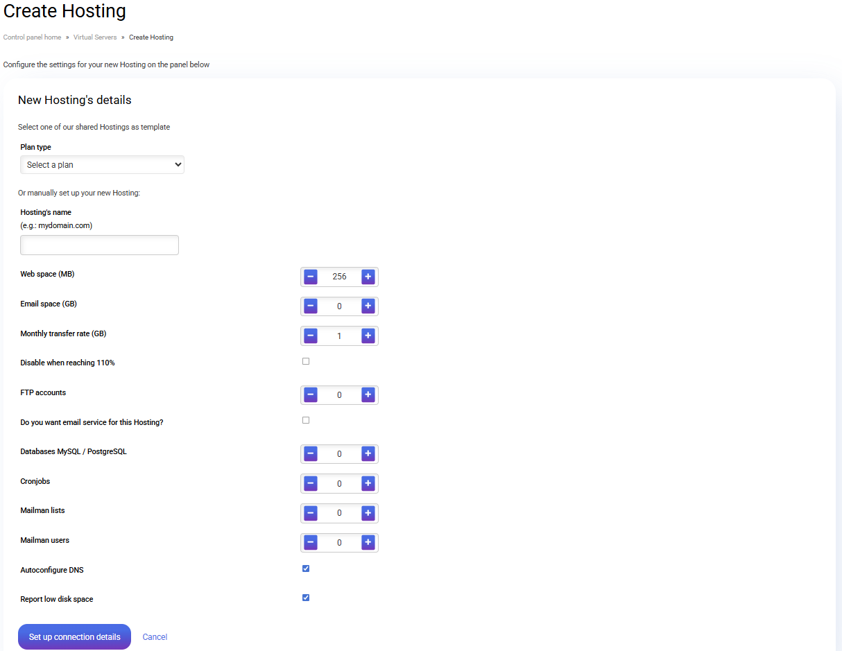 Once we click on the "Create hosting" button, we will access a form that will allow us to create the web hosting by distributing the available resources.