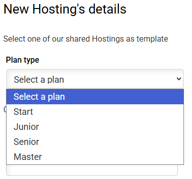 - Type of plan: You can select any of our hosting plans and the features of it will be automatically assigned. It is a template with features: